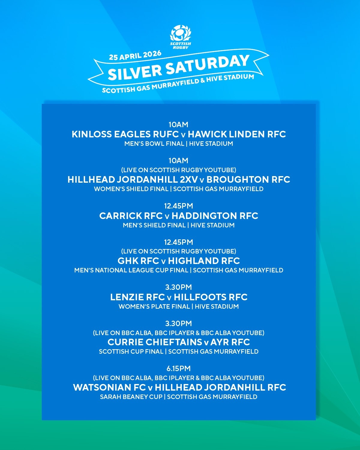 Silver Saturday returns this weekend with four of Scottish Rugby’s domestic finals broadcast live throughout the day from Scottish Gas Murrayfield.