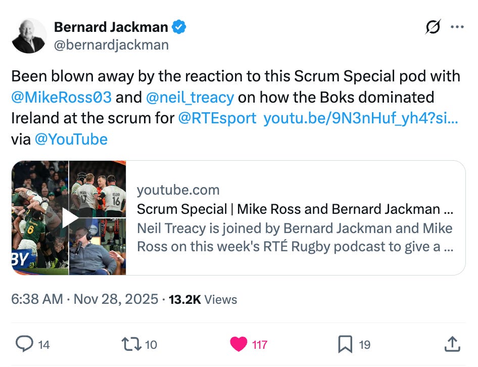 This week a number of podcasts focussed on scrums, with the RTÉ Rugby Podcast featuring Bernard Jackman and former Irish international Mike Ross already attracting 45,000 views on YouTube.